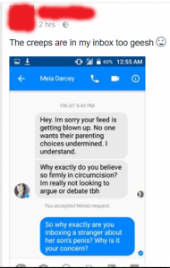 Mention on Facebook that you have had a son circumcised and see what happens. Mothers, who may already have post-partum depression to contend with, are mercilessly hounded: http://www.sheknows.com/parenting/articles/1079990/moms-innocent-facebook-post-about-circumcision-takes-a-horrifying-turn and https://blogs.babycenter.com/parenting/i-was-mom-bullied/ Sadly, this is all too common. “Mutilation Watch” has been replaced by Brother K as leader of the bullies, and it shows no sign of relenting. What follows is just a selection taken from the pages of victims, or from intactivists’ own pages. Medical professionals are also targeted. See: https://www.circumcisionchoice.com/single-post/2017/02/22/Circumcision-Providers-Attacked-A-Physicians-Story-About-Intactivism and http://kpcnews.com/columnists/terry_gaff/kpcnews/article_3e299632-5b5b-5766-8694-eb91b751724b.html for two examples. Sadly they are not alone. As the victims have suffered enough, their identities have been concealed in the collection below.